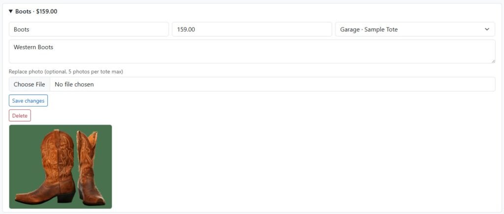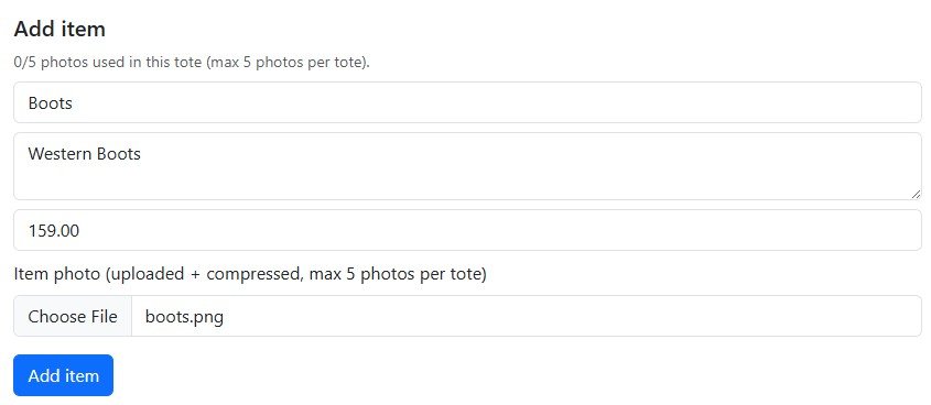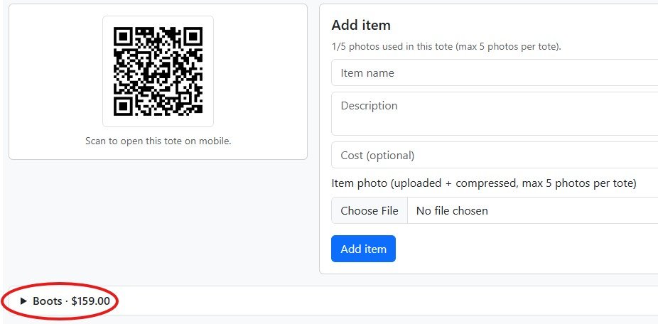 In the Add Item area Enter the Item, any notes, cost of the item and a photo then click Add Item: