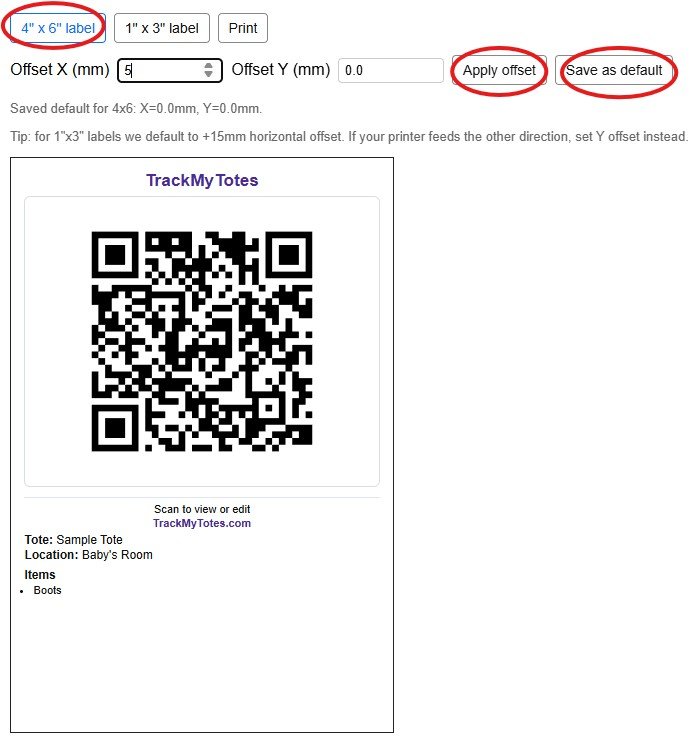 When the print label page opens we recommend using 4″x6″ label to print on actual labels or paper. We tested with the iDPRT SP420 which you can purchase using this link. Otherwise, use whatever printer you have available. When printing if the label is printed to far left or right you can use the X Offset to move the label. Positive numbers move the print to the RIGHT or DOWN from the TOP of the label. Negative numbers Move the label LEFT or UP from the TOP of the label. Click apply offset and do a test print. Once you have your offset for your printer set, click SAVE AS DEFAULT: